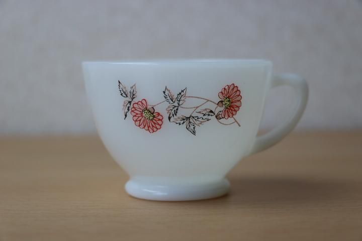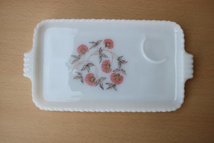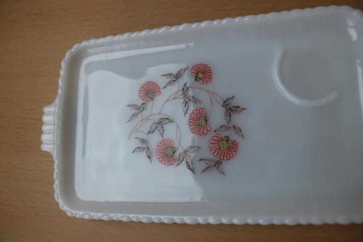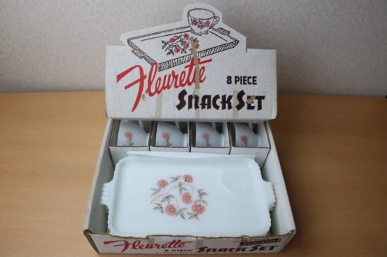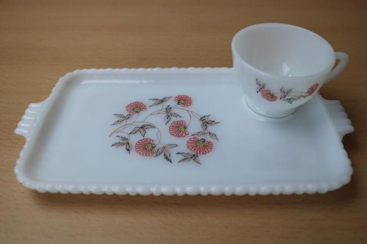 コメント:小さいお花たち(Fleurette)がdecal(転写)された、かわいいミルクガラスのスナックセットです。