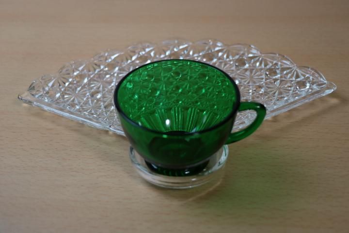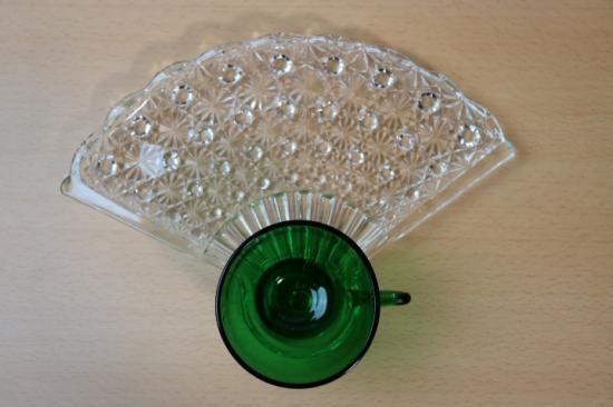 コメント:扇形のプレートと美しいフォレストグリーンのスナックセットです。
