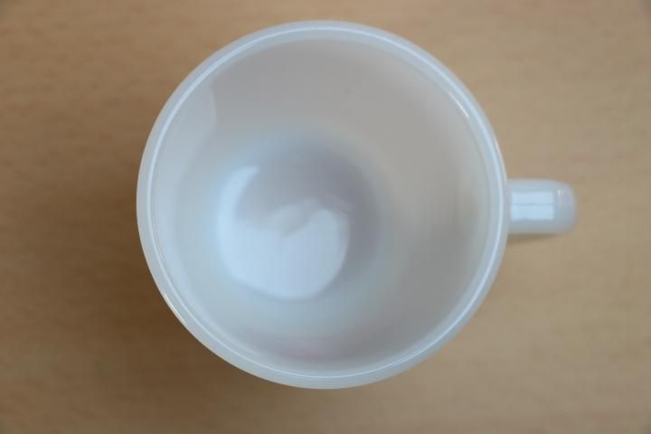 コメント:ESSO Service Stationsで配布されたESSOタイガーシリーズで、1950年代は周囲を包み込んだタイガーデザインで、ヘーゼルアトラスによるマグとタンブラーが造られましたが、ミルクガラスは1959年からファイヤーキングによるショートマグとなり、その後こちらのDハンドルとなりました。